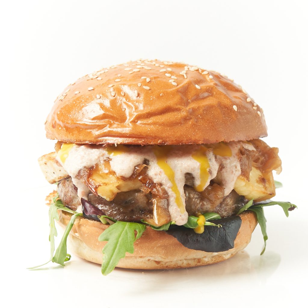 Cosmopolita y ecléctica hamburguesa con confitura de piña, mostaza dulce, panceta, Provolone, mezclum de lechugas y salsa Chimichurri.
