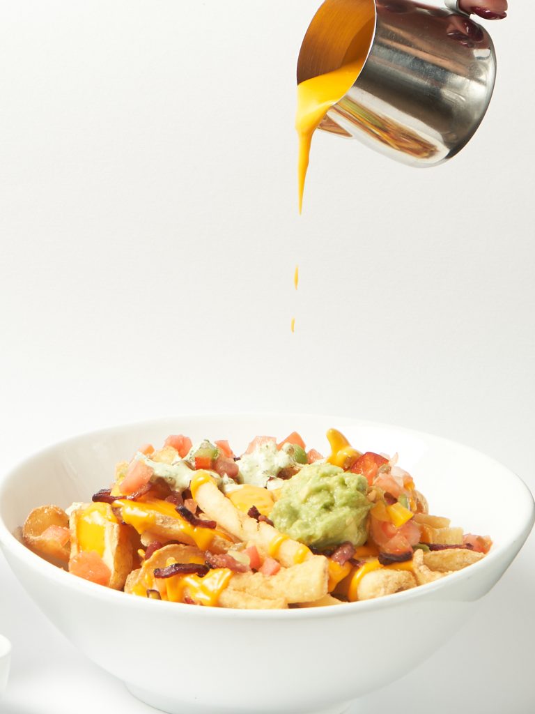 Bañadas con queso Cheddar fundido y salpicadas con bacon crujiente . Conviertelas en Especiales por 2.00 con guacamole , crema agria, pico e gallo, y salsa de cilantro y jalapeño. Te haras adicto a ellas,